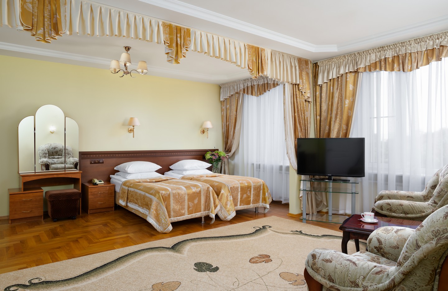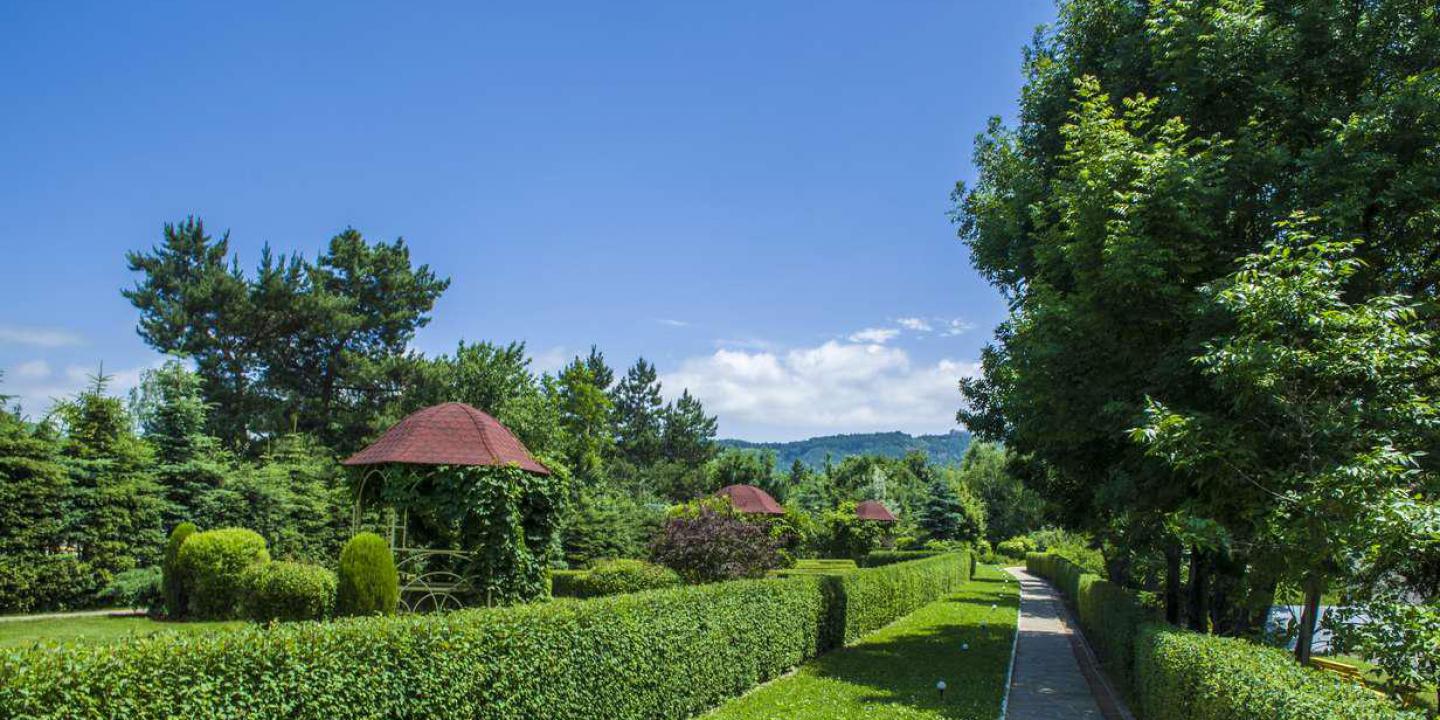 На территории работают бар и столовая, где гости могут заказать себе питание, в том числе и диетическое. К услугам гостей банный комплекс с сауной и крытым бассейном, в теплое время года все желающим доступен летний открытый бассейн. Для любителей активного образа жизни предусмотрены спортивный и тренажерный, площадки для спортивных игр, теннисный корт, регулярно проводятся занятия по аквааэробике и фитнесу. По вечерам в санатории проходят досуговые мероприятия — концерты, показы кинофильмов, развлекательные программы, есть бильярд. Гостям доступны услуги прачечной, беспроводной интернет и охраняемая автостоянка. Для детей организована игровая комната, работают воспитатели.
