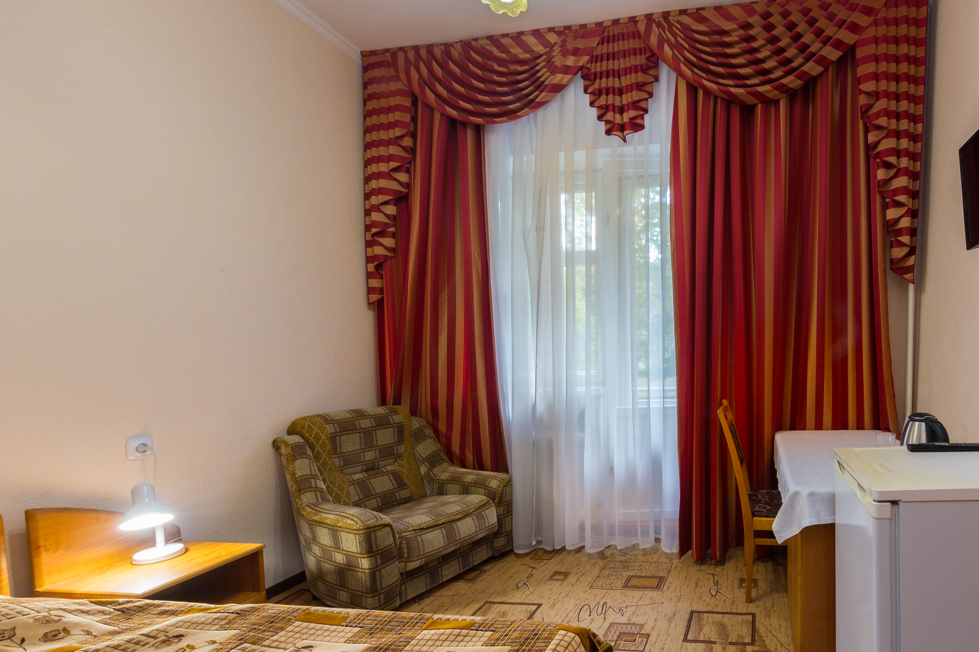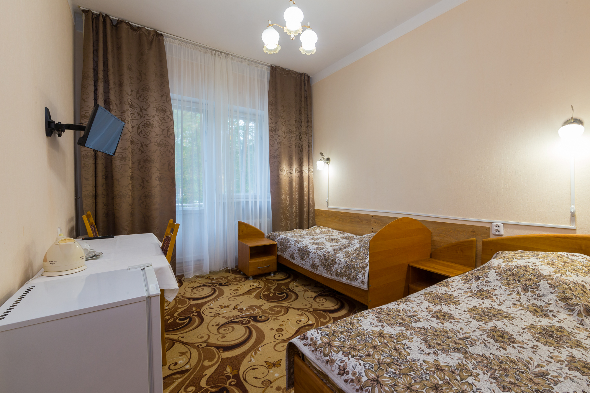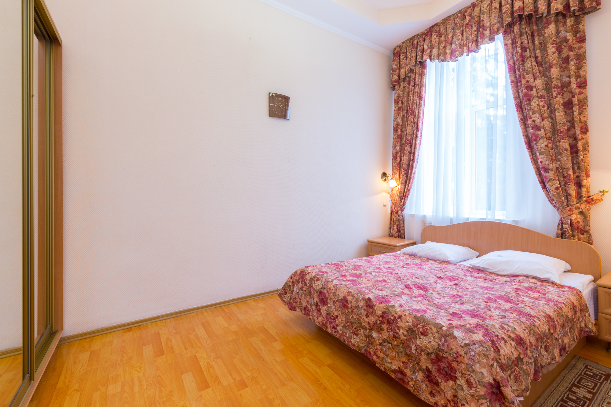 В санатории можно проживать самостоятельно или с детьми от 4 лет. Он состоит из двух двухзвездочных корпусов и трехзвездочного VIP-пансионата, именуемого «Дачей космонавтов». Вместительность главного корпуса составляет 210 человек, а дополнительного – 58. Есть двух-, одноместные стандарты, номера класса «Люкс», в которых удобные спальные места, телевизоры и холодильники. «Дача Космонавтов» располагается непосредственно в курортном парке и состоит из 6 номеров класса «Люкс», а также отдельной столовой, нарзанных ванн.