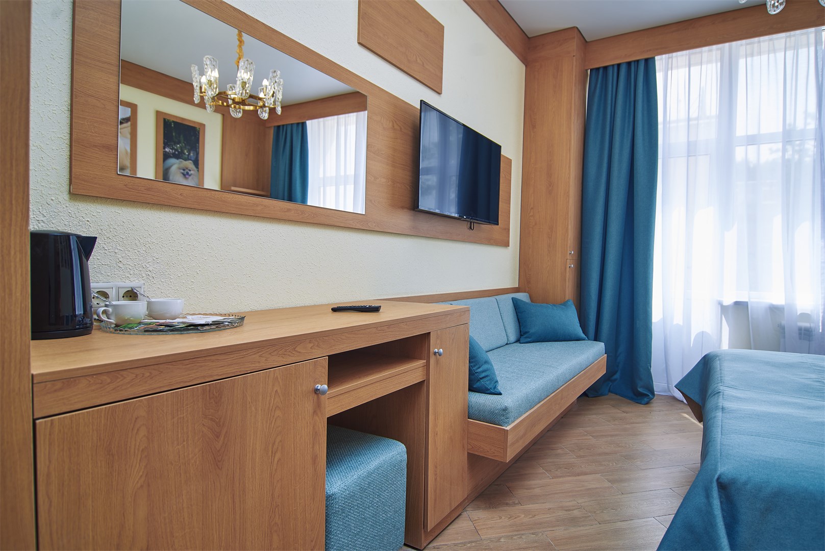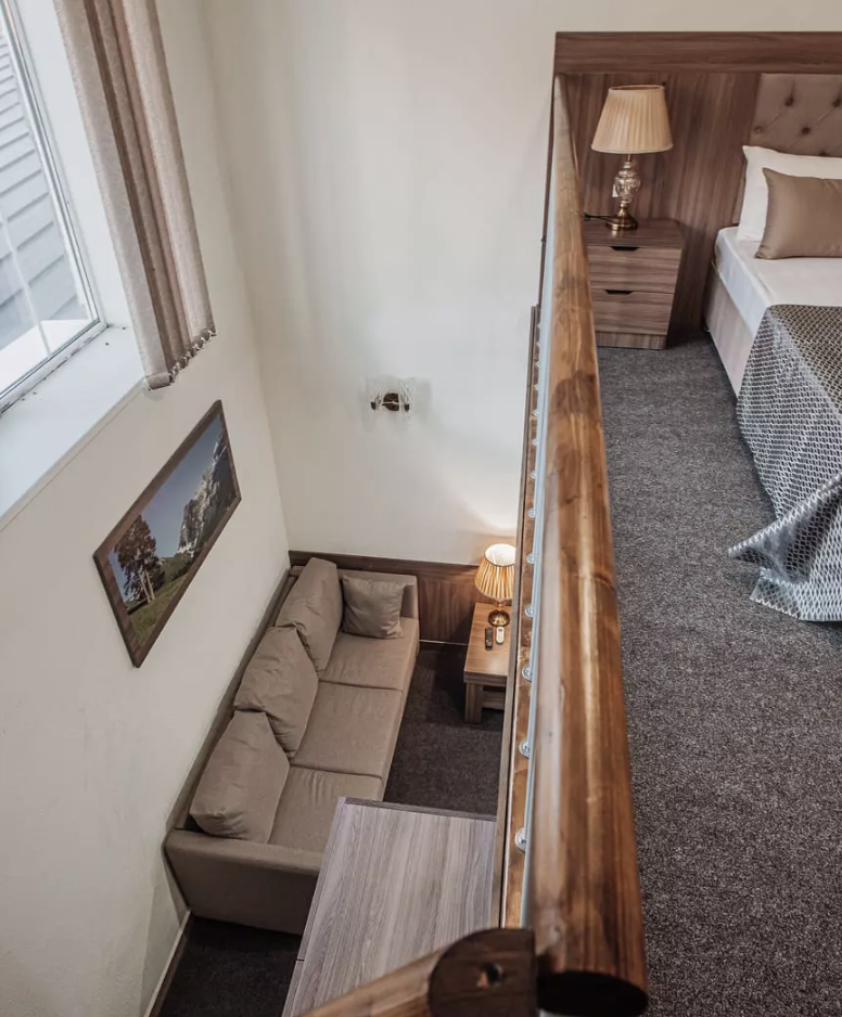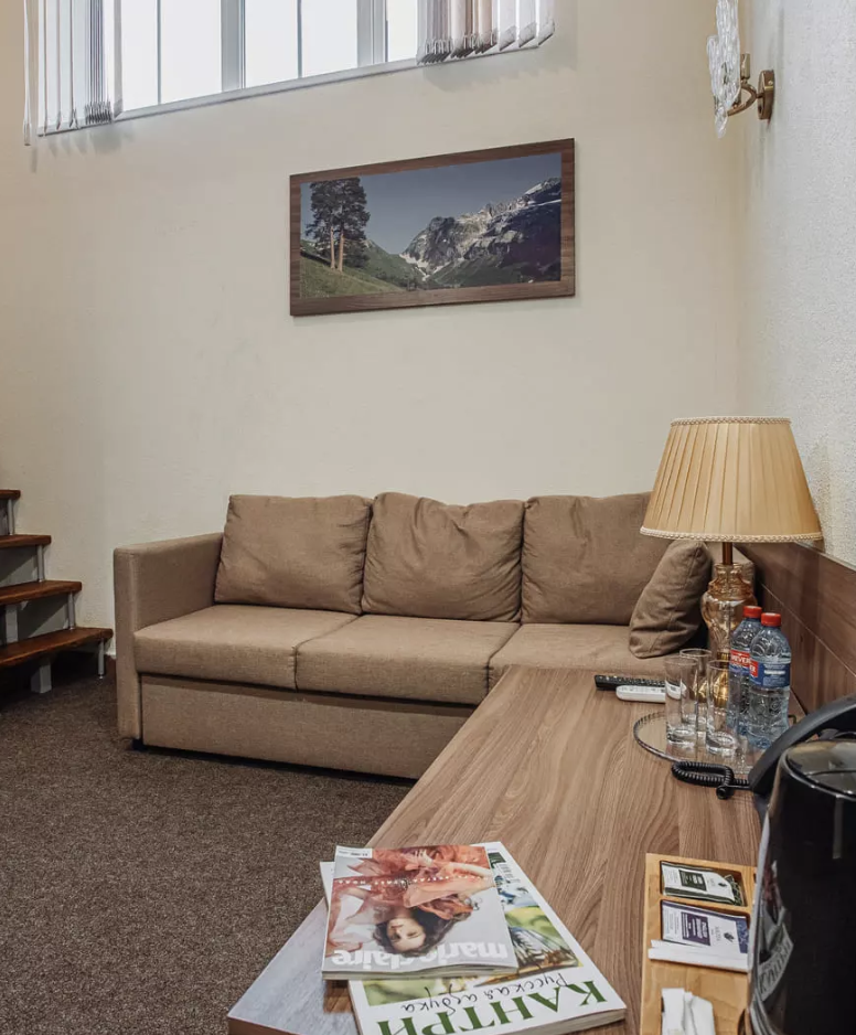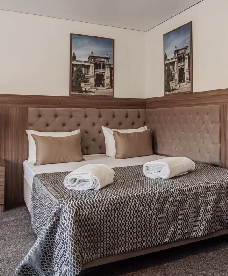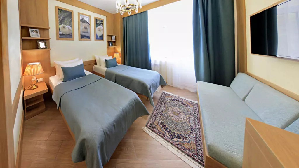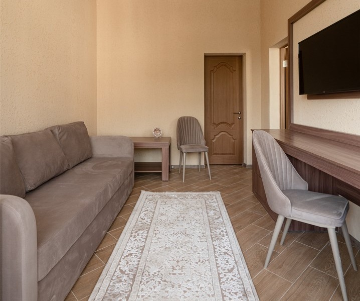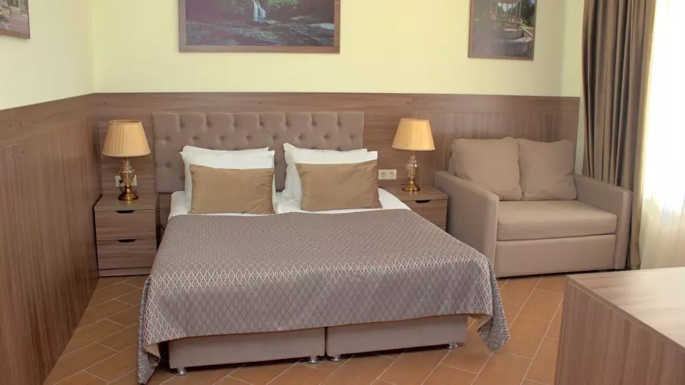 Санаторий расположился в 5-этажном здании, являющимся архитектурным и историческим памятником города. Номера выполнены в современном лаконичном стиле. В комнатах установлена удобная мягкая мебель, есть места для хранения одежды, большой телевизор с плоским экраном, кондиционер, холодильник. Санузел индивидуальный для каждого номера, оснащен душевой. Гостям предоставляются тапочки, халаты, полотенца, туалетно-косметические принадлежности, фен. Питание в столовой санатория организовано по разным системам, в зависимости от заболевания и назначенной диеты отдыхающего.