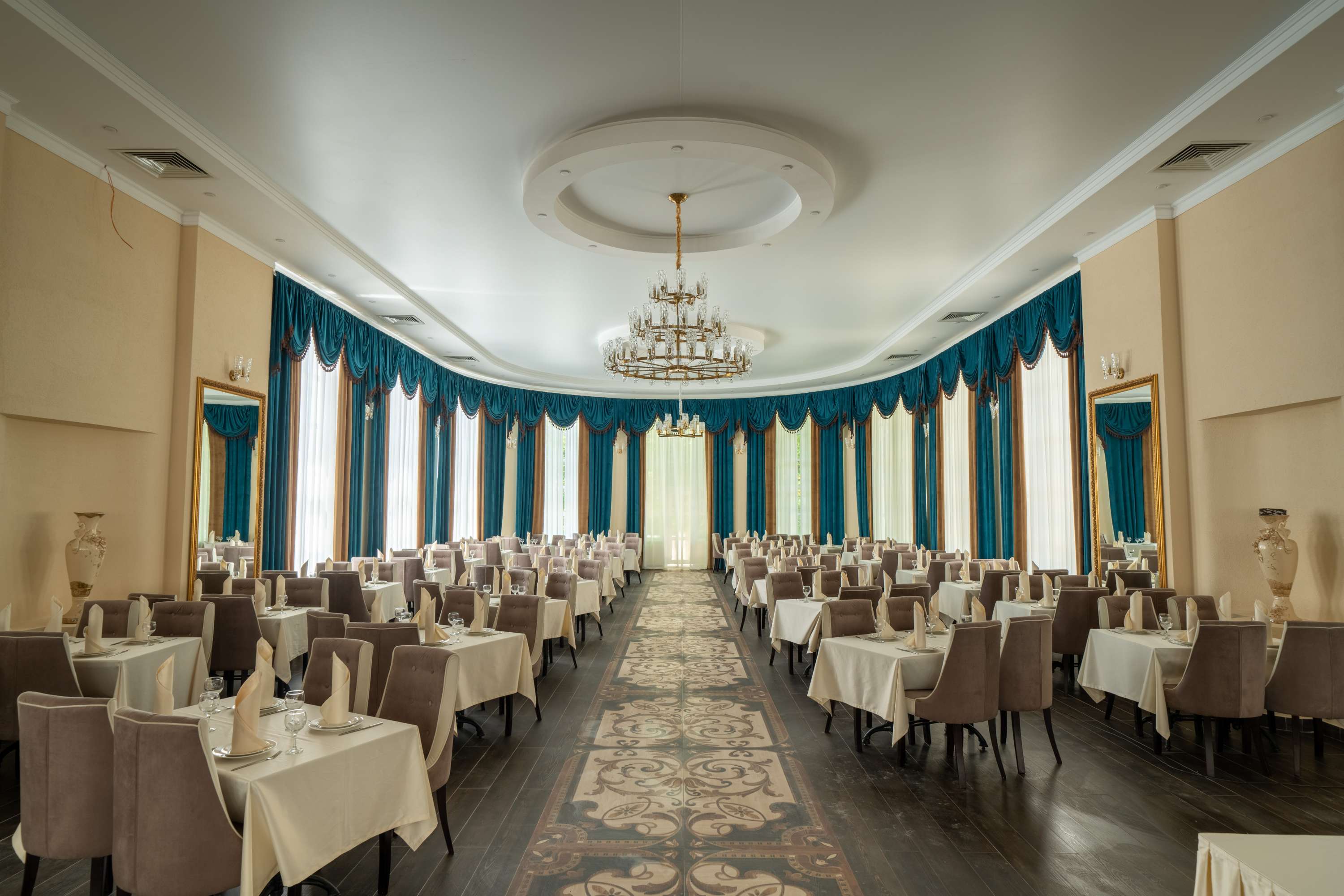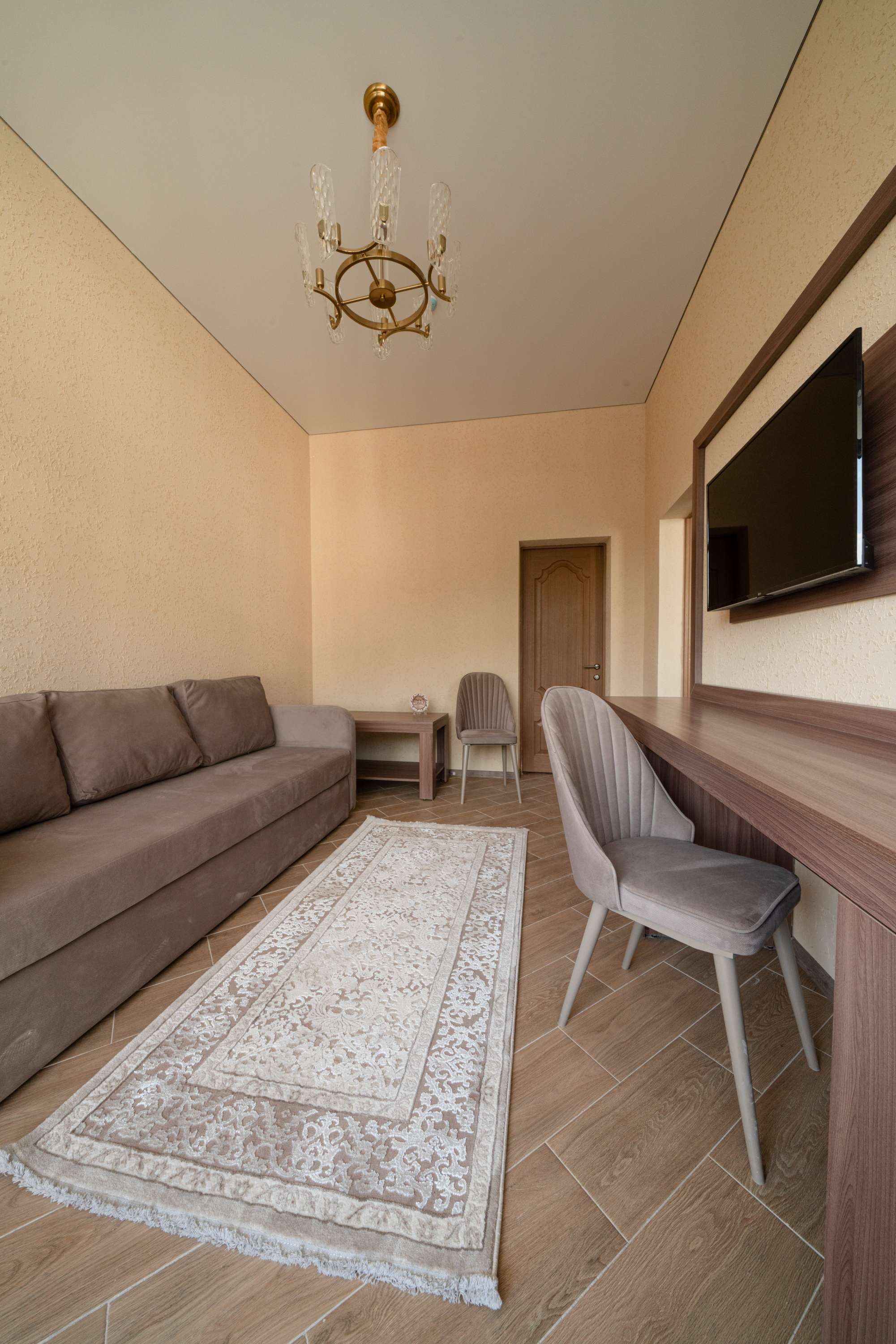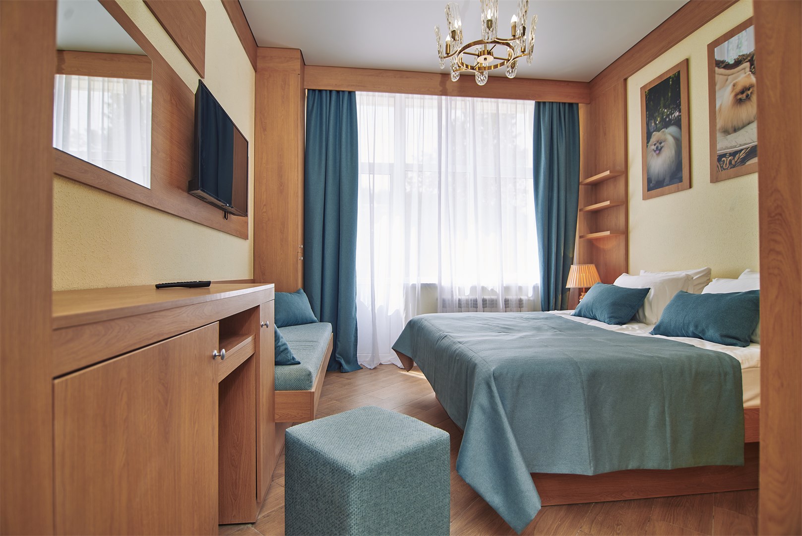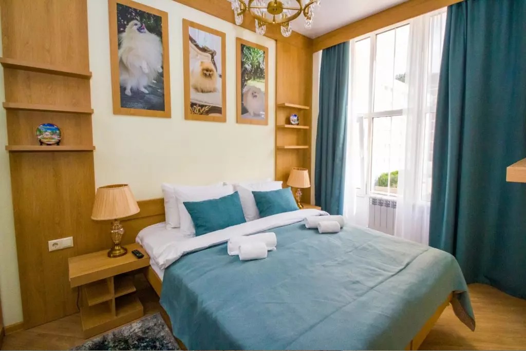 Санаторий расположился в 5-этажном здании, являющимся архитектурным и историческим памятником города. Номера выполнены в современном лаконичном стиле. В комнатах установлена удобная мягкая мебель, есть места для хранения одежды, большой телевизор с плоским экраном, кондиционер, холодильник. Санузел индивидуальный для каждого номера, оснащен душевой. Гостям предоставляются тапочки, халаты, полотенца, туалетно-косметические принадлежности, фен. Питание в столовой санатория организовано по разным системам, в зависимости от заболевания и назначенной диеты отдыхающего.